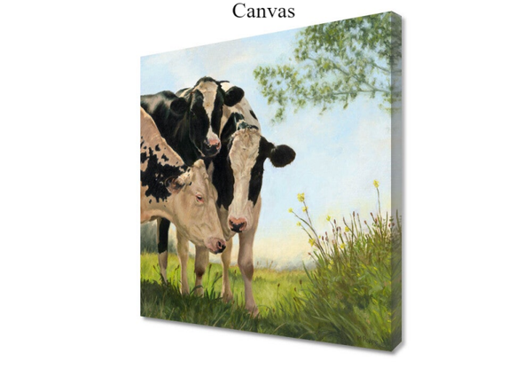Het is een hete zomerdag in een natuurgebied in Salland en deze koeien hebben de koppen bij elkaar gestoken. Waar zouden ze het over hebben? Het originele schilderij is gemaakt met olieverf op een 30x30 cm paneel in 2024.